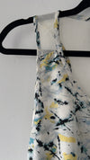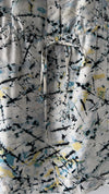 Yellow, black, blue off-white drizzle pattern dress with mesh back. Dropped drawstring waist. Casual wear with 2 pockets.