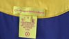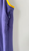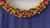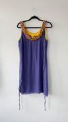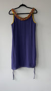 Standout royal blue mini dress with amazing collar of multicolor dainty beadwork. Sleeveless mini with rouching on both sides and tie in royal blue ribbon tie.